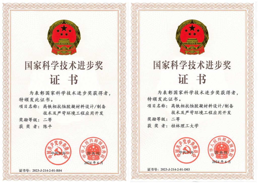 6月24日,全国科技大会、国家科学技术奖励大会、两院院士大会在京召开,会议宣布了2023年度国家科学技术奖励结果,我院陈平教授作为第四完成人、桂林理工大学作为第三完成单位的“高铁相抗蚀胶凝材料设计/制备技术及严苛环境工程应用开发”项目荣获国家科学技术进步奖二等奖。这是陈平教授团队继2011年获得国家技术发明奖二等奖以来,再次荣获国家级科技奖励。