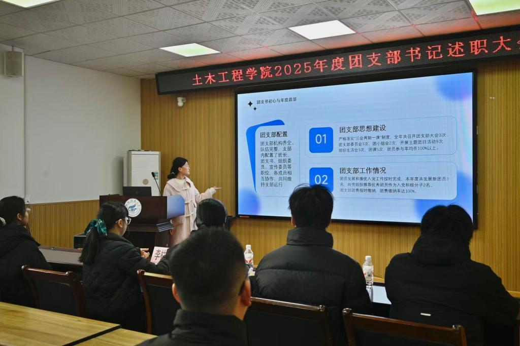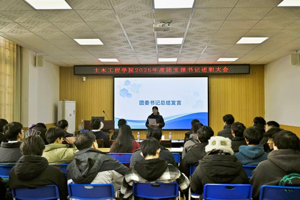 会上,李林军老师回顾学院共青团年度工作,强调团支部书记作为“领头雁”的关键作用,希望全体团支书以此次述职为契机总结经验、明确方向,推动基层团建工作提质增效。述职环节中,各年级团支部书记依次进行述职,围绕思想引领、组织建设、学风建设、实践服务、特色活动等核心工作维度,全面复盘了本年度支部工作实绩,并结合支部实际提出了针对性改进思路与下年度工作计划。李林军老师肯定了年度团建成效,提出三点要求:一是创新理论学习形式,强化思想引领;二是夯实组织基础,提升支部战斗力;三是打造土木特色品牌活动,增强团组织凝聚力。