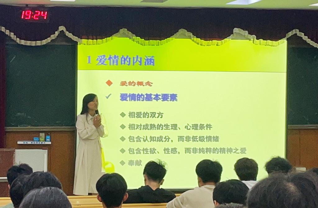讲座上,谭老师从诗词中的爱情切入,为大家讲述了什么是爱情,爱情的基本要素,不同的恋爱类型之间有什么区别,处于爱情中的心理特征,引导大学生应当如何去爱,谭老师表示“无私的爱”包括关心、责任、尊重、理解四个方面,鼓励大家不自卑,勇敢爱,并告诉大家失恋了又该如何自我调节。同时,谭老师从心理学的角度解读爱情,分析了大学生谈恋爱的利与弊、择偶时的心理特点,与同学们讨论了大学生关于爱情的非理性观念,通过对比男女生之间的择偶观,恋爱中心理、需求、对另一半要求的差距。最后谭老师对大学生的恋爱现状提出了自己的看法,提倡一段健康的爱情需要男女双方之间相互信任,要给予对方承诺。