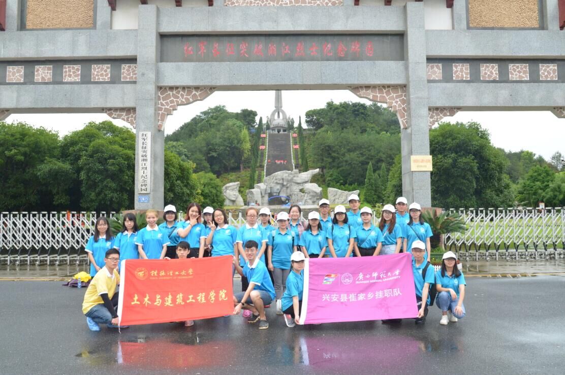 湘江烈士纪念碑园是为了纪念红军长征中突破惨烈、悲壮的湘江战役,抚慰烈士英魂,教育后代,经聂荣臻元帅建议,国务院批准,于1993年在广西桂林兴安县修建完成,碑园由大型群雕、主碑、纪念馆组成,艺术地再现了当年红军突破国民党第四道封锁线的壮烈情景。两校队伍在烈士陵园门前和红军长征突破湘江战役烈士纪念碑前一起拍照合影,两校负责人对本次两校合作进行了深刻地交流,双方表示都很期待这一次的共同合作。拍照结束后双方队员怀着无比崇敬的心情一起去烈士碑前为革命先烈默哀行礼,在默哀的过程中大家仿佛身临其境地看到了革命先辈们舍生忘死、浴血奋战的壮烈过程,大家都被烈士先辈在湘江战役中所体现出对党和国家忠诚的坚定信念,以及顾全大局、勇于牺牲的爱国精神深深折服,在心里表示强烈的感谢和尊敬。最后两校实践团队成员在陵园工作人员的引导下去为陵园除草、捡拾白色垃圾,大家都积极地投入到本次活动中,为陵园的绿化环境贡献自己的力量。