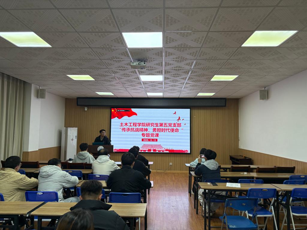 为深入学习贯彻习近平新时代中国特色社会主义思想,扎实推进中国共产党人精神谱系宣讲工作,持续加强党员理想信念教育,12月12日,学院研究生第五党支部在4203会议室召开支部大会。党支部书记谢基柱以“传承抗战精神,勇担时代使命”为题,为全体党员讲授了一堂主题鲜明、内涵深刻的专题党课,支部全体党员参加学习。