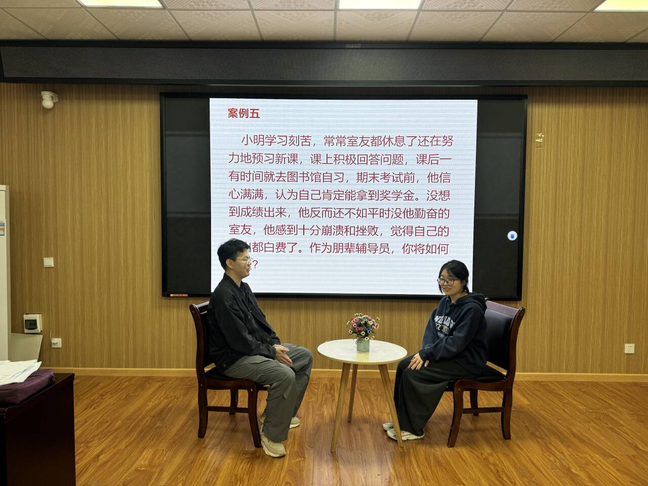 本次大赛分为心理健康知识笔试与朋辈心理辅导模拟两个环节。选手们围绕心理危机干预、情绪管理、人际沟通等内容展开理论考核,全面检验专业知识储备。辅导模拟环节正式开赛,选手随机抽取学业压力、人际关系困扰等校园常见场景,在10分钟内现场展示倾听、共情、疏导与干预能力。评委由学院辅导员及往届获奖选手组成,从沟通技巧、方案可行性等维度综合评分。